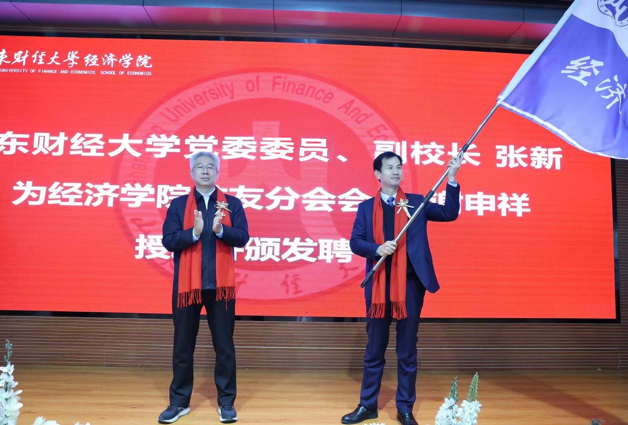 张新向校友会经济学院分会会长谢申祥授旗并颁发聘书。