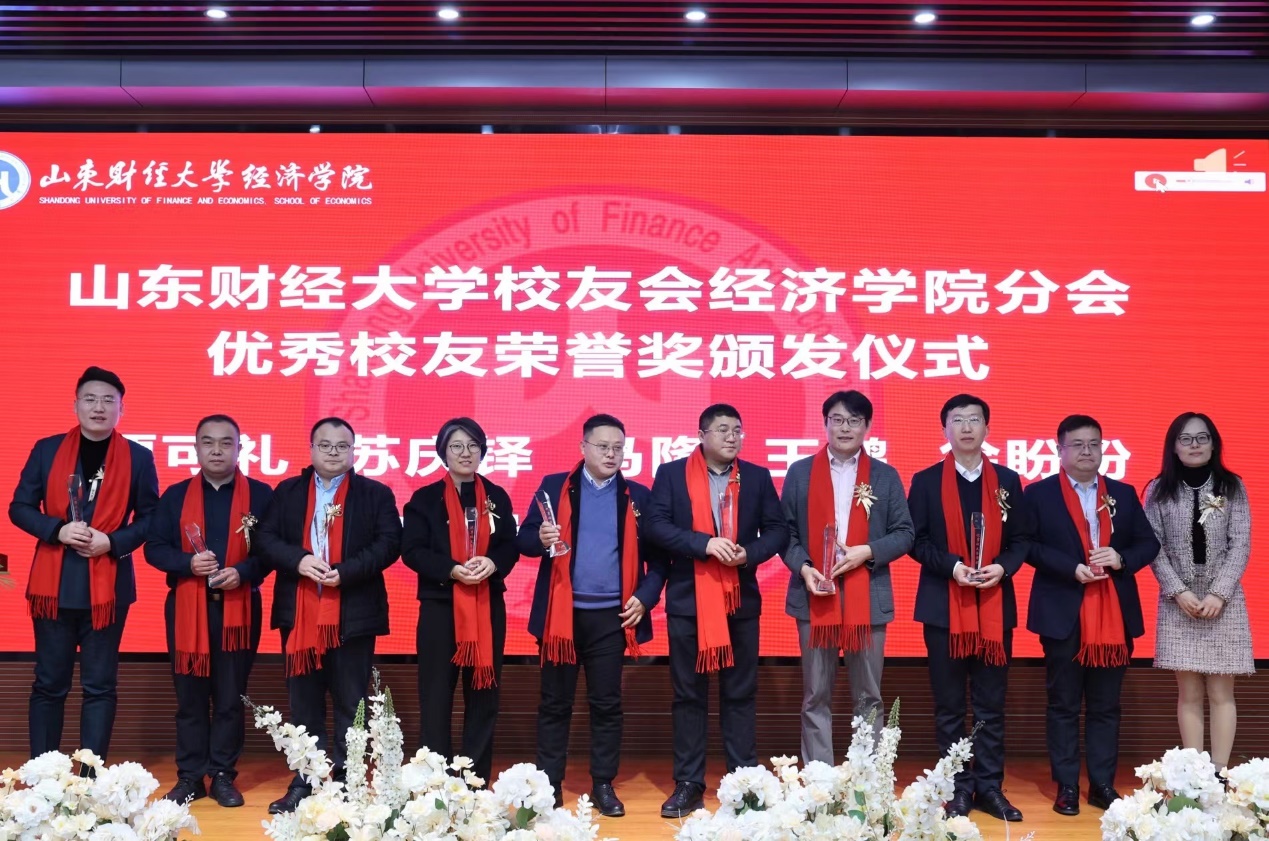 学院校友分会秘书长李冰封为优秀校友贾可礼、苏庆铎、马隆、王鹏、徐盼盼、周庆贵、闫瑞鹏、王东亮、张大尧颁发山东财经大学经济学院优秀校友荣誉奖。