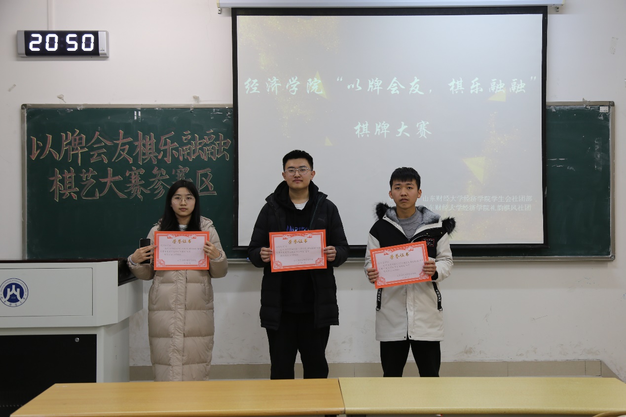 (通讯员:叶雨涵 许佳璇)为普及棋牌类知识,丰富学生日常生活,12月5日下午18:00,经济学院于圣井校区敏行楼举办“以棋会友,棋乐融融”棋牌大赛。各学院2019级、2020级26名学生参加。