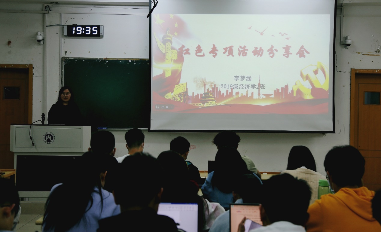 2019级经济学L1班马颖、2019级经济学2班李梦涵以及2019级经济学4班刘雪丽分享了寒假参加红色专项活动的心得体会,讲解参加红色专项活动的前期准备、调研过程、感悟所得,并分享了调研的成果,鼓励同学们积极参与,真正将爱党爱国的家国情怀与实践创新相结合。