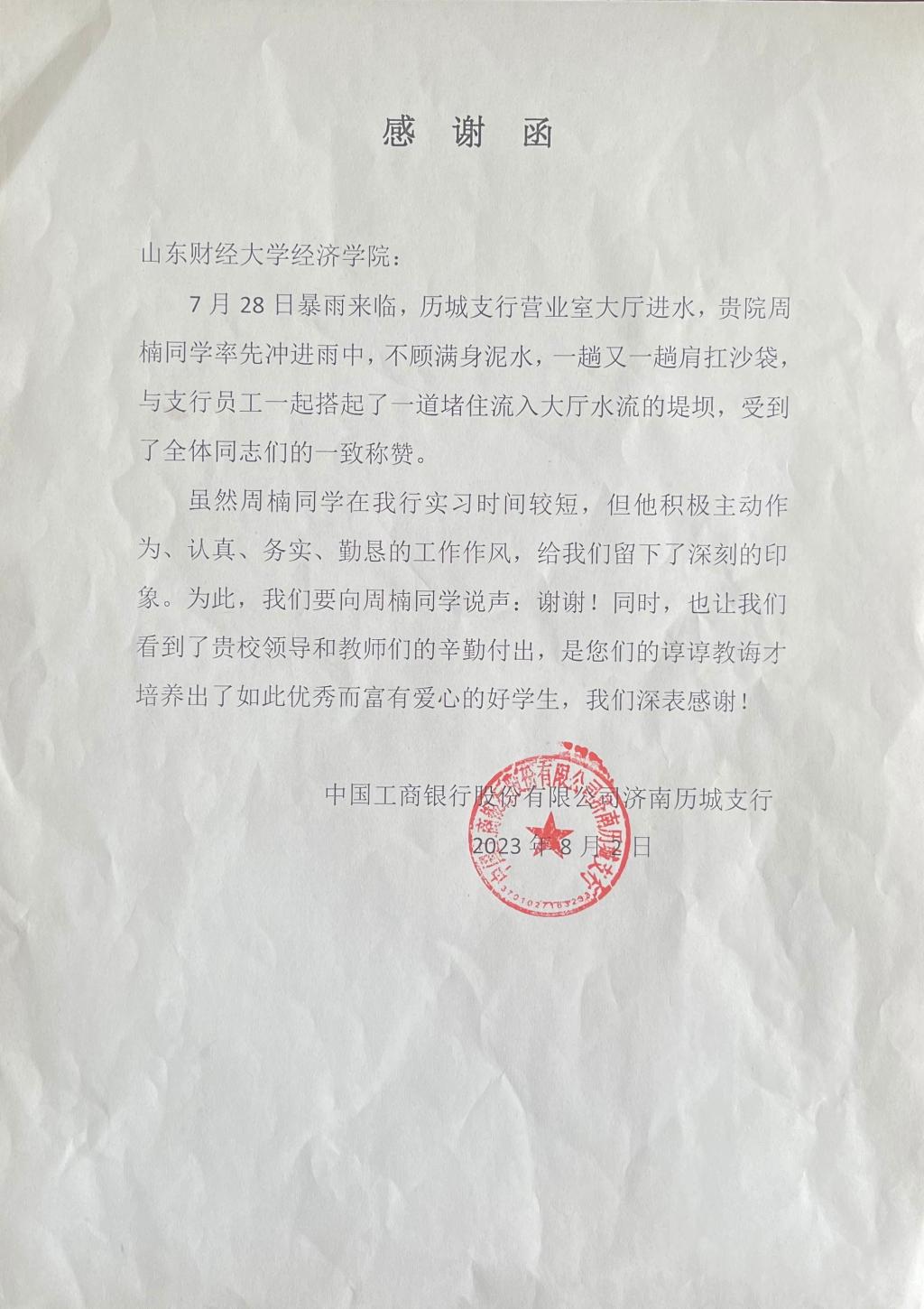 暴雨来临时,中国工商银行股份有限公司济南历城支行营业室大厅进水,雨水不断地从地缝往大厅里涌。当时在支行实习的山东财经大学经济学院2023级研究生新生周楠二话不说,和同事一起拿起拖把往外推水。由于雨势太大,推水的效果并不是很好,周楠又率先冲进雨中,不顾满身泥水,一趟又一趟肩扛沙袋,与支行员工一起搭起了一道堵住流入大厅水流的堤坝。本以为是件再平常不过的小事儿,中国工商银行济南历城支行特意发来感谢信。信中说到:“虽然周楠同学在我行实习时间较短,但他积极主动作为、认真、务实、勤恳的工作作风,给我们留下了深刻的印象。为此,我们要向周楠同学说声:谢谢!同时,也让我们看到了贵校领导和教师们的辛勤付出,是您们的谆谆教诲才培养出了如此优秀而富有爱心的好学生,我们深表感谢!”