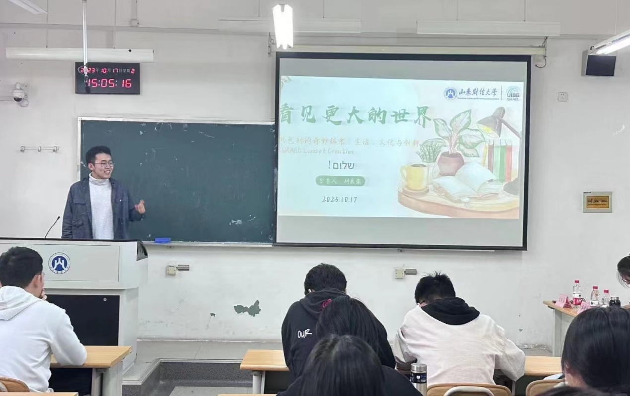 刘展豪以“看见更大的世界”为主题,与同学们分享了他在外经贸大学以色列分校的访学和生活经历。访学共包含批判性与创造性思维、以色列文化概论、希伯来语、管理经济学与组织行为学等五门课程,拓宽了学术视野,提升了学术能力。同时,他还向同学们介绍了以色列这个国家的基本概况以及其多元化、包容性和创新性等特点。他深入探讨了以色列创新力的来源,并分享了自己对巴以冲突时事热点的见解。刘展豪告诉同学们,访学有助于拓宽视野,感受文化的碰撞与交融,为生活与科研提供全新的思考角度。