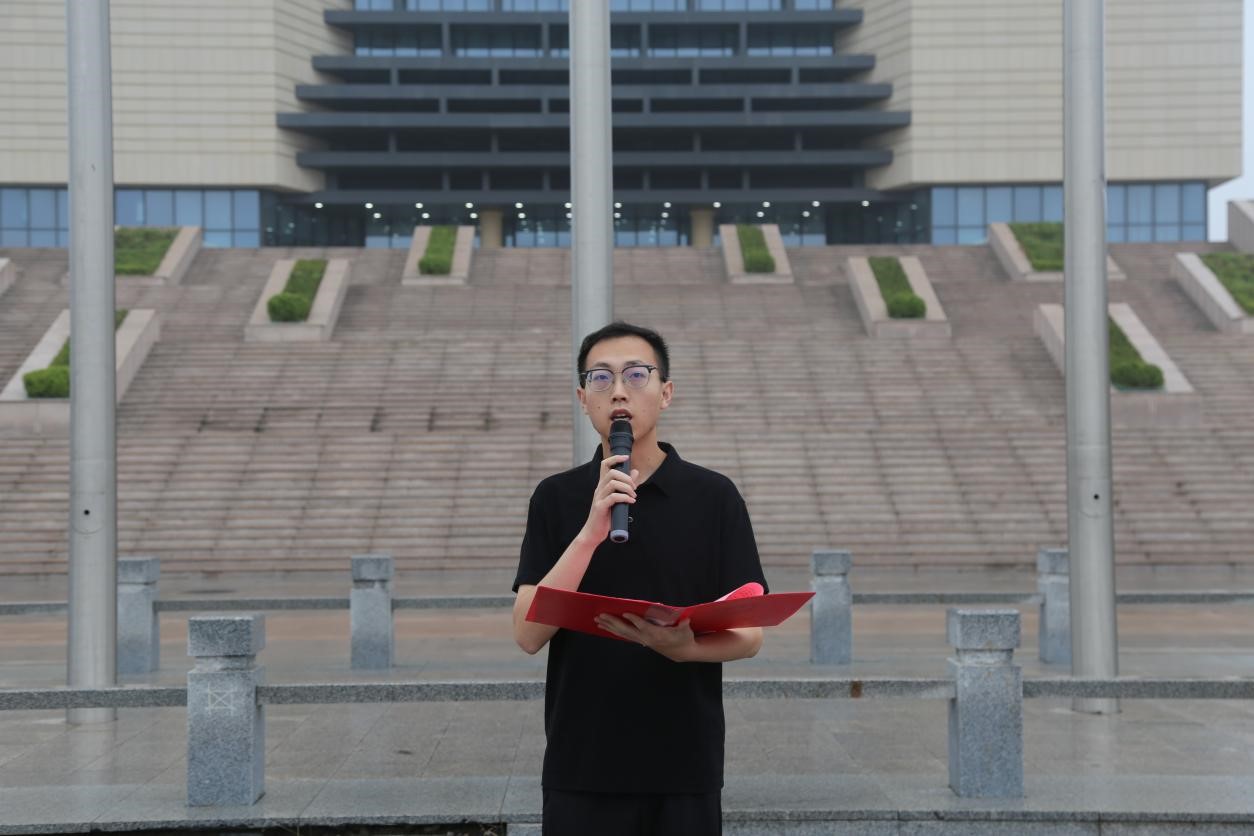 仪式最后,杨瑞宸、李岳铮、张天然、牛乐为全体师生带来了《青春中国》的朗诵,激昂的朗诵声回荡在校园上空,学子们时而深情舒缓,时而慷慨激昂,用声音描绘着青春中国的蓬勃生机,用情感传递着当代青年的使命担当。